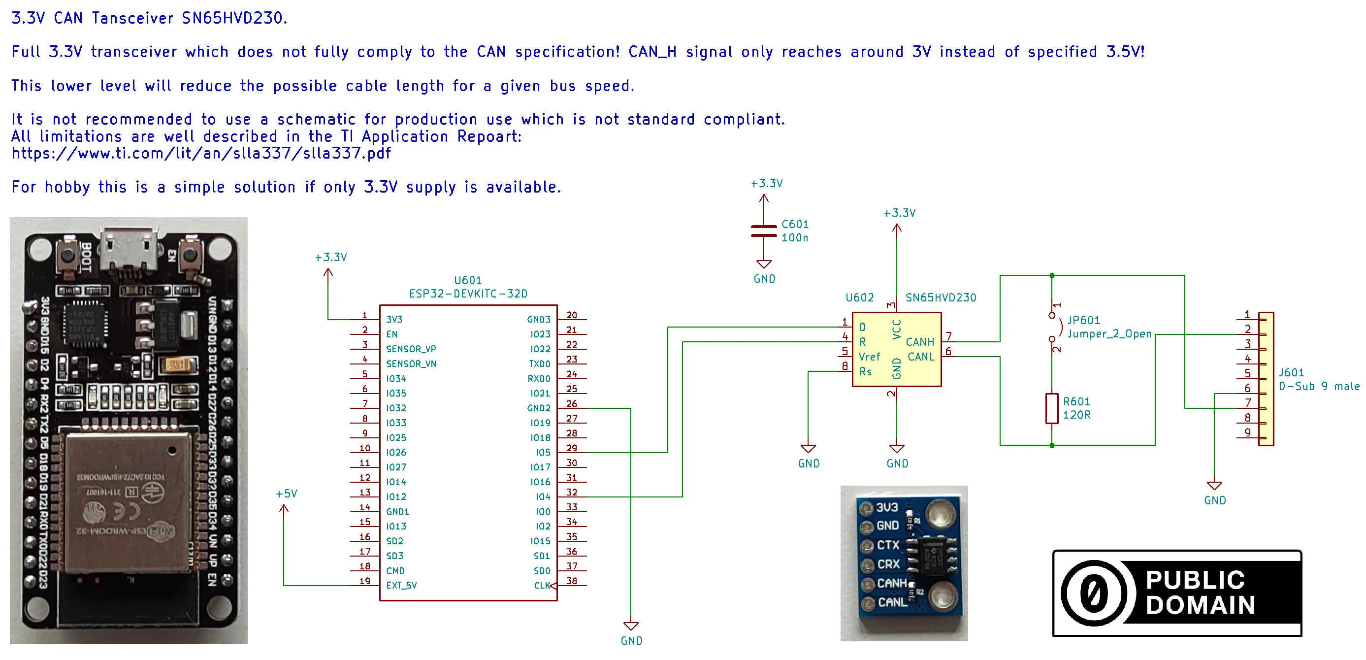 Section titled “Wiring options”5V CAN transceivers are cheap and generate compliant levels. If you power your board with 5V this is the preferred option. R501 is important to reduce the 5V logic level down to 3.3V, to avoid damaging the ESP32. You can alternatively use a voltage divider here instead.