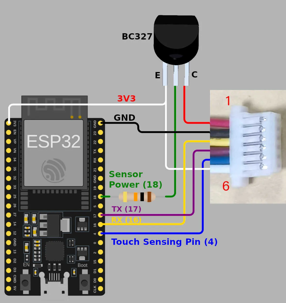 To implement this feature, you will need one more free GPIO pin to toggle the sensor power on and off and two external components: a 10kOhms resistor and a PNP transistor (like a BC327).