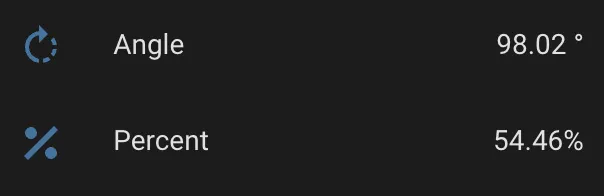 as5600: id: my_as5600sensor: - platform: as5600 update_interval: 1s name: Angle unit_of_measurement: '°' accuracy_decimals: 2 icon: mdi:rotate-right filters: - delta: 1 - lambda: 'return x * as5600::RAW_TO_DEGREES * id(my_as5600).get_range_scale();'as5600: id: my_as5600sensor: - platform: as5600 update_interval: 1s name: Percent unit_of_measurement: '%' accuracy_decimals: 2 icon: mdi:rotate-right filters: - delta: 1 - lambda: 'return (x / as5600::POSITION_COUNT) * 100;'