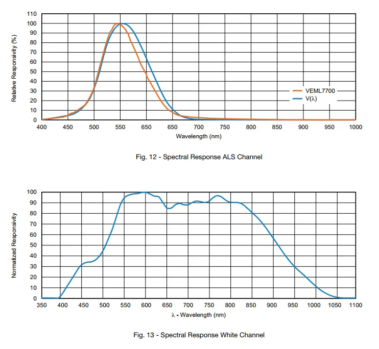 The sensor has two photodiodes with different spectral response represented by two channels: an ALS channel and a WHITE channel. The ALS, or Ambient light channel follows a so-called human eye curve very closely. The WHITE channel covers a much wider wavelength/spectrum, capturing quite a lot of near-infrared radiance.