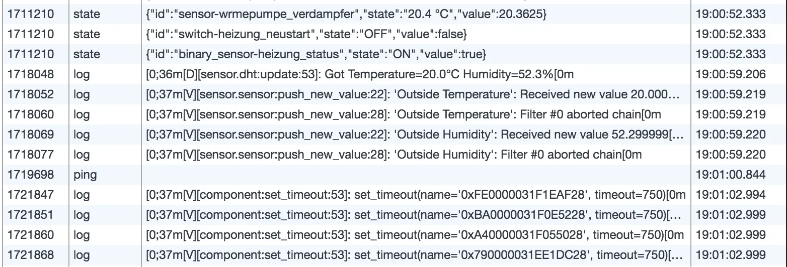 Currently, there are three types of events sent: ping, state and log. The first one is repeatedly sent out to keep the connection alive. log events are sent every time a log message is triggered and is used to show the debug log on the index page. state is where the real magic happens. All events with this type have a JSON payload that describes the state of a component. Each of these JSON payloads has the following identifier fields: